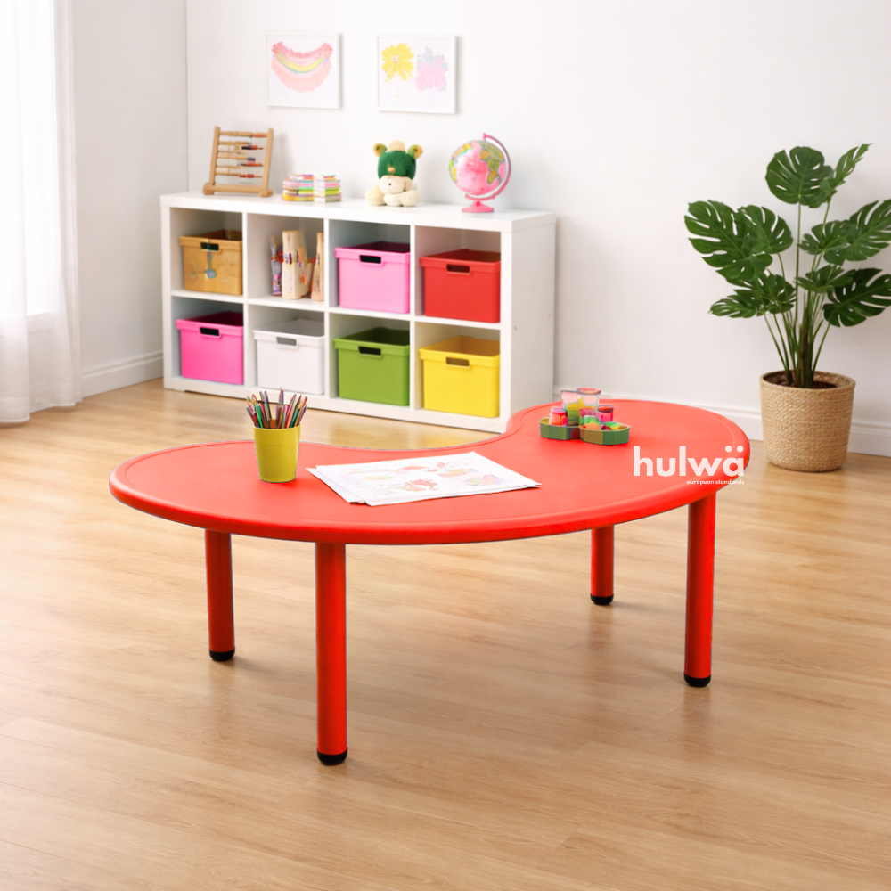 Meja berbentuk bulan sabit atau setengah lingkaran dengan cekungan kecil di tengahnya, dapat menampung efektif hingga 8 anak. Model meja ini adalah yang paling best seller, karena bisa di formasikan agar membentuk lingkaran kecil hingga lingkaran lebih besar.