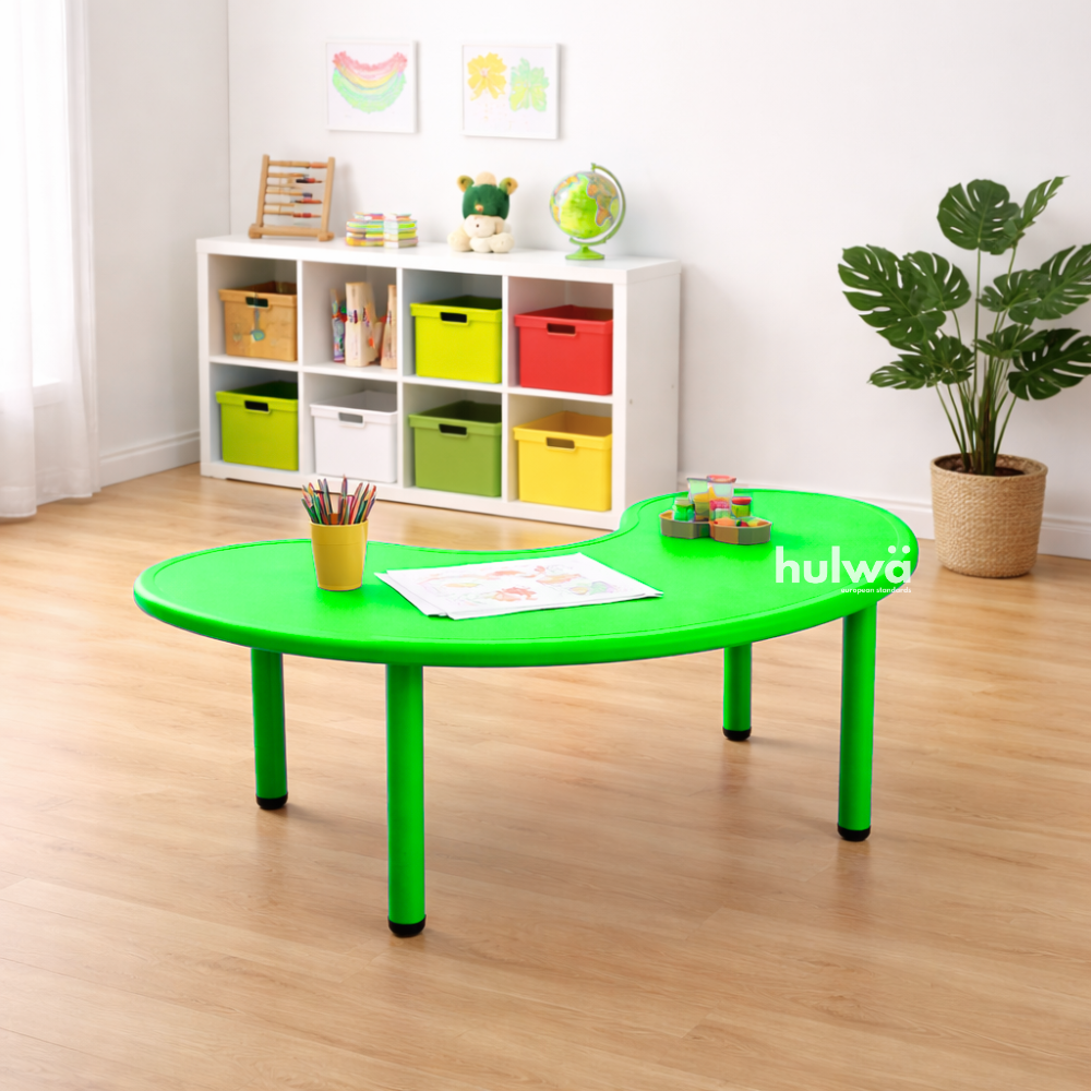 Meja berbentuk bulan sabit atau setengah lingkaran dengan cekungan kecil di tengahnya, dapat menampung efektif hingga 8 anak. Model meja ini adalah yang paling best seller, karena bisa di formasikan agar membentuk lingkaran kecil hingga lingkaran lebih besar.
